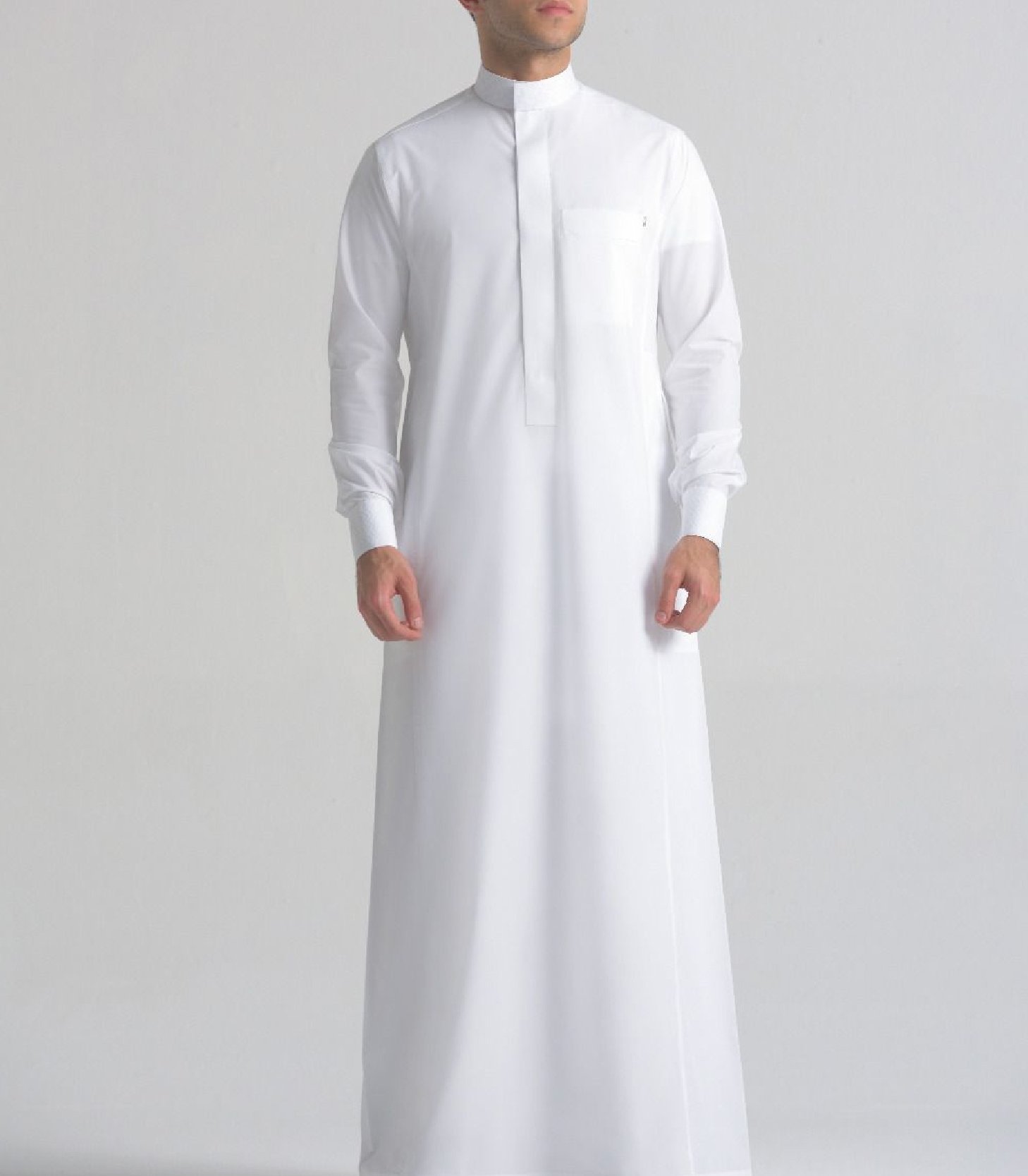 【Style】Chinese collar, shirt sleeve,placket with four buttons,left chest pocket and two side pockets. Modern classic men’s muslim arab robe, soft,loose, cool & comforatable fabric is good for summer.
